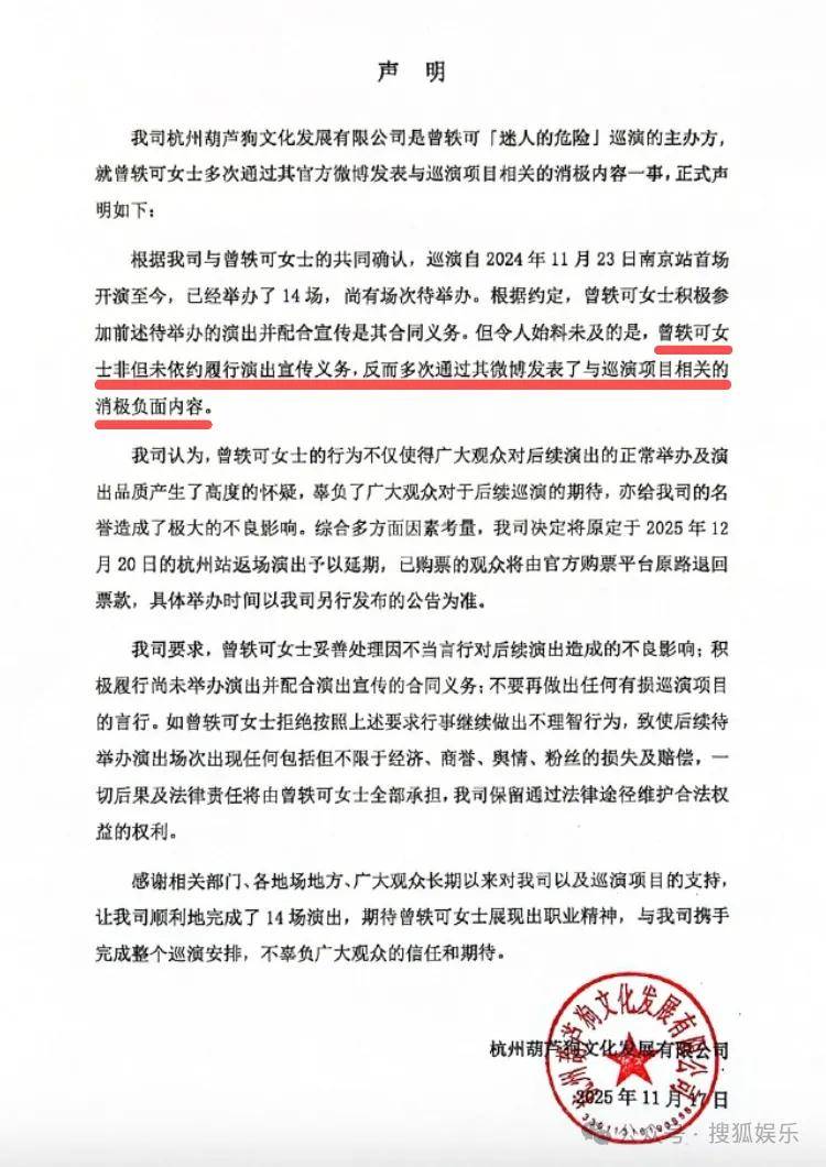 直至昨日,巡演主办方还出来现身说法,称因为曾轶可多次发表巡演相关消极内容导致票房崩盘。