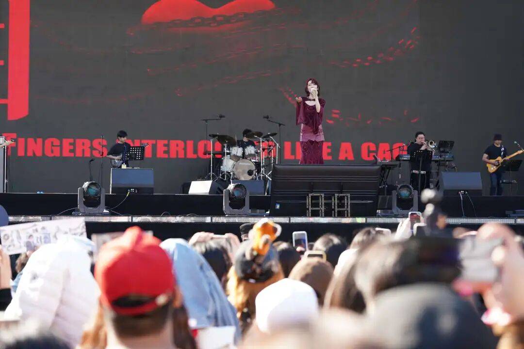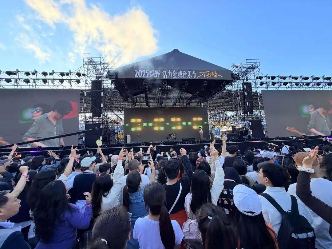 当日13时,音乐节在绿野先声乐队组冠军的激情演绎中拉开帷幕,青春旋律瞬间点燃全场。随后,众多音乐人轮番登台,风格各异的表演掀起阵阵热浪:汪峰以《怒放的生命》《北京北京》等经典之作引发现场万人大合唱,高亢嗓音穿透夜空;草蜢乐队活力演绎《失恋阵线联盟》等金曲,带领观众重温青春记忆;薛凯琪身着灵动舞台装惊艳亮相,以《苏州河》《剩下的你听懂我吗》等歌曲勾起浓郁港乐情怀,并用略带港普的亲切问候拉近与观众的距离,甜美元气的舞台表现力让全场持续沸腾;刘恋的优雅吟唱、五条人的质朴叙事同样收获乐迷热烈回应。