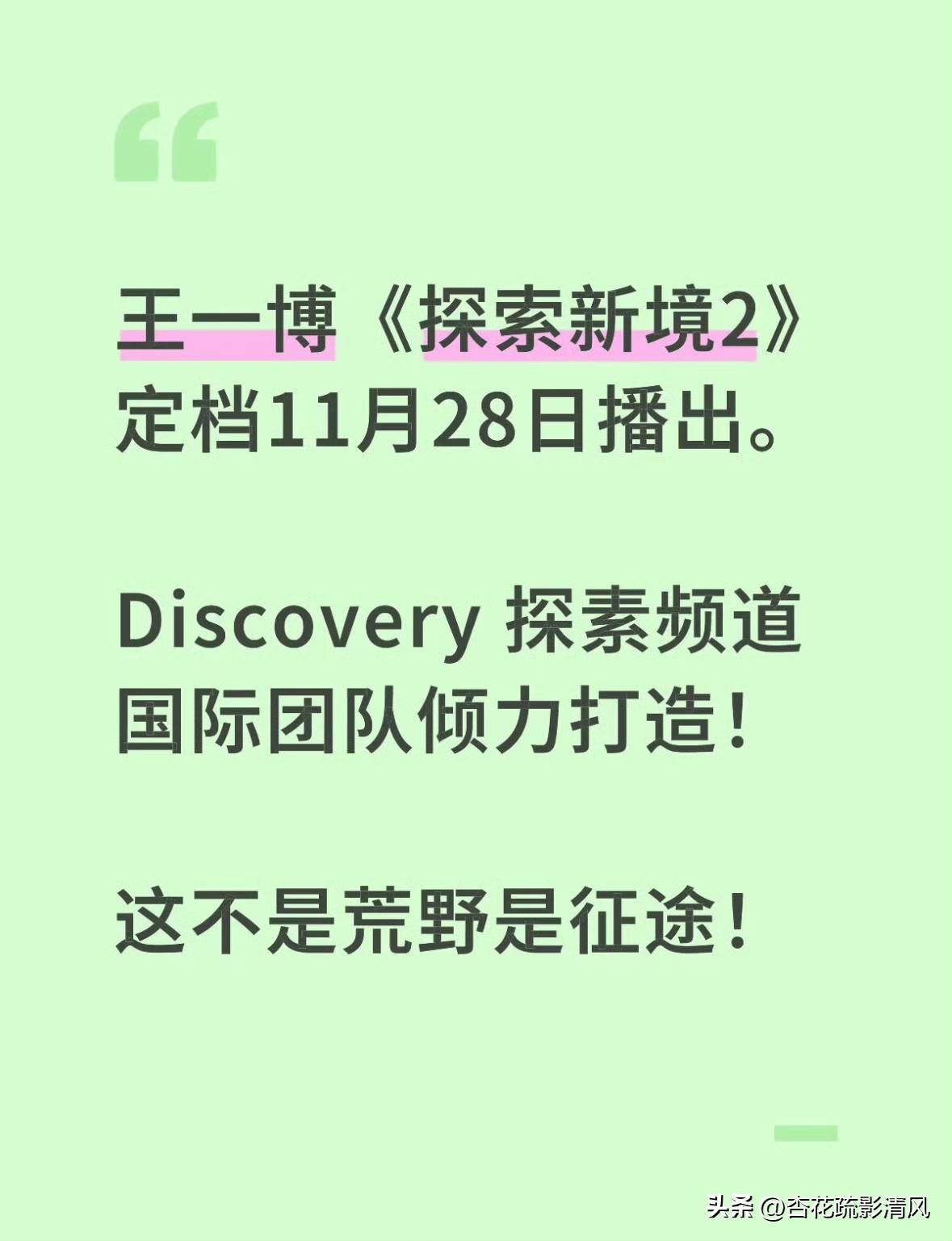 这部纪录片由Discovery探索频道制作,由奥斯卡最佳纪录片导演金国威全程拍摄,王一博亲自发起,独家拍摄,成为真正的大IP,腾讯视频独播。第二季将于11月28日起播出,届时邀你一起品味这场精彩的视觉盛宴。