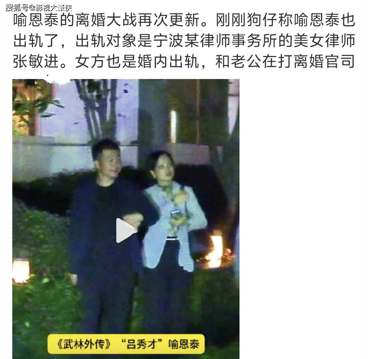 最搞笑的是卓伟这边还发出了喻恩泰疑似也婚内出轨的视频,视频中喻恩泰和美女律师亲密挽手一同回家,而这位女律师也在和丈夫打离婚官司,现在进入二审了,有人表示美女律师很有可能是替喻恩泰打离婚官司的律师,一来二去就和男方日久生情了。