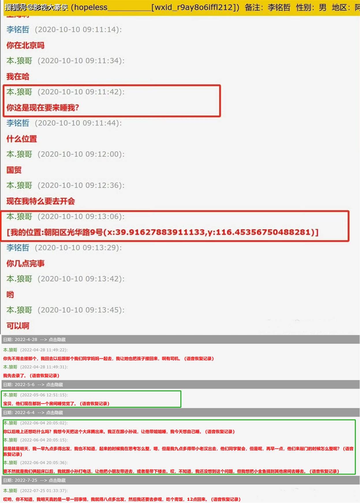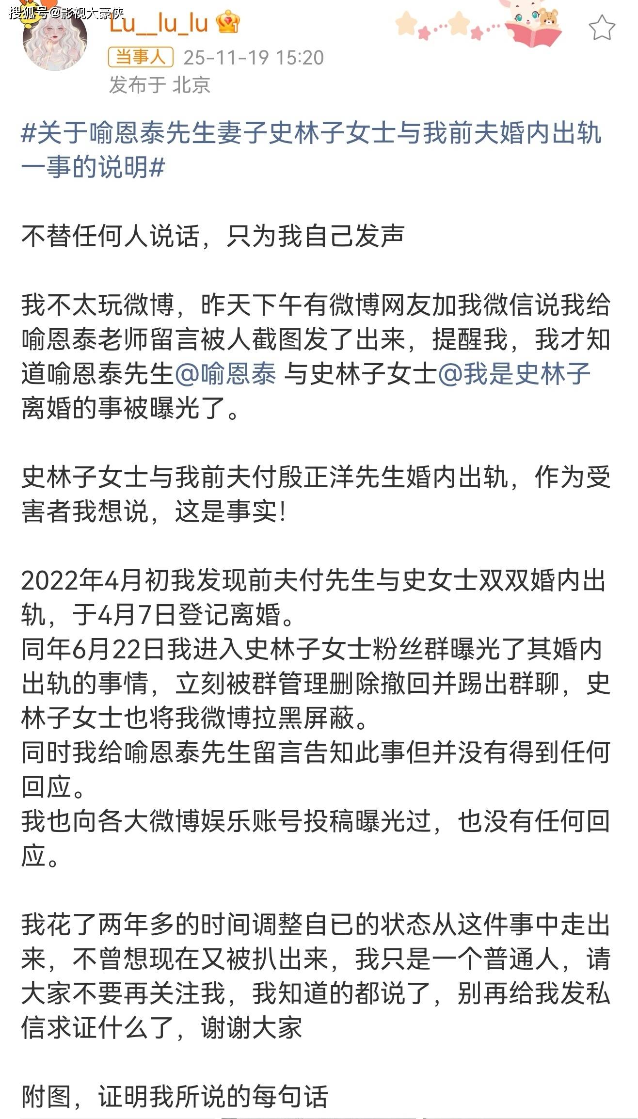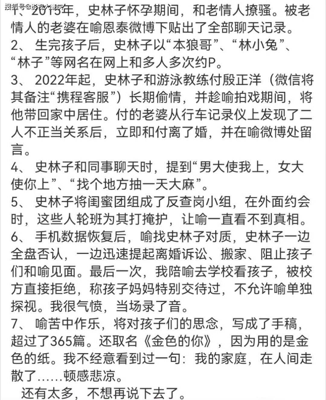 上图中女生掌握了前夫和史林子出轨的行车录音,成功离婚。此外喻恩泰和史林子的共同好友也发长文力挺喻恩泰,表示从2015年开始,史林子就在出轨了!是出轨常客!值得一提的是,史林子和和喻恩泰在2015年1月21日就结婚了。史林子对共同好友发出消息,希望他劝喻恩泰回家,但喻恩泰这边已经知晓了妻子出轨的事情,原因是女方为了证实自己没有出轨,把清空撩骚信息的手机递给男方,却被男方恢复了聊天记录。女方在怀孕期间和老情人撩骚,生完孩子后更是以各种网名和多人多次约p,2022年和游泳教练付殷正洋长期偷情,还把人带回家居住,女方更是把闺蜜团当作反查岗小组,打掩护,更透露喻恩泰提起离婚后,是女方偷摸把孩子带走,并拒绝男方探视。