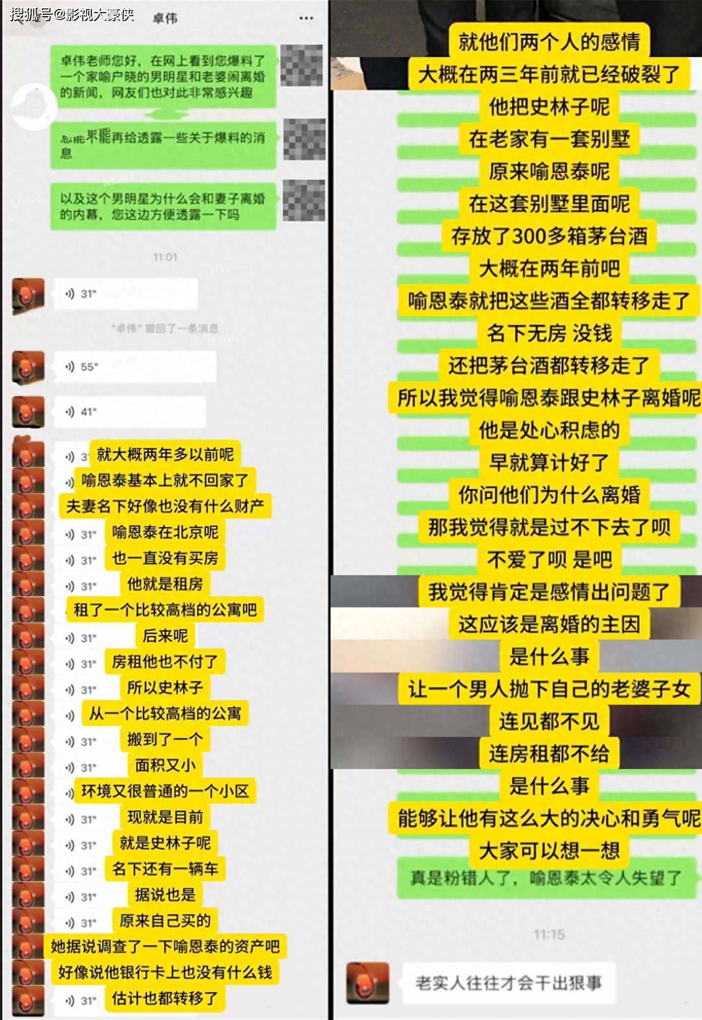 谁也没想到,“中国第一狗仔”居然翻车了,本来是轰轰烈烈复出秀,这下子成为圈内笑话了。卓伟先是放出烟雾弹:“高学历男星和结婚多年的妻子已离婚,感情破裂反目成仇”,随后揭秘这个人就是靠着《武林外传》中吕秀才一角爆红的喻恩泰,前段时间还因为陈都灵主演的《雁回时》中的毒父亲庄仕洋而引发热议。卓伟透露:“两人在两三年前就感情破裂,喻恩泰将放在史林子老家别墅内的300箱茅台酒转移走了,账户上也没钱,拒绝支付2孩子的抚养费,导致女方从北京高级公寓挪到了普通出租房。”为此最终有了“老实人往往才干出狠事”的结论。