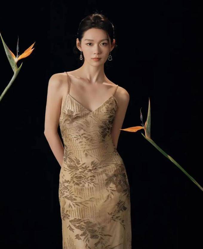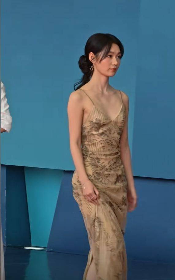 这一次,段奥娟选择了一条杏色带有印花的吊带长裙。从远处看,上面的印花宛如水墨画,不仅低调而奢华,还充满了深意,完全展现了她的优雅气质。