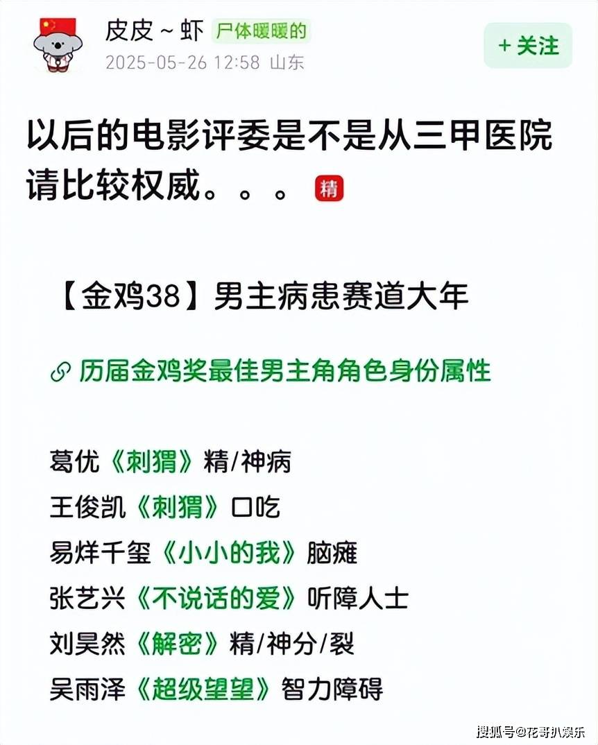 本届金鸡奖的审美偏好也让人摸不着头脑,尤爱患病群体?建议以后干脆从三甲医院请评委,还更权威点。