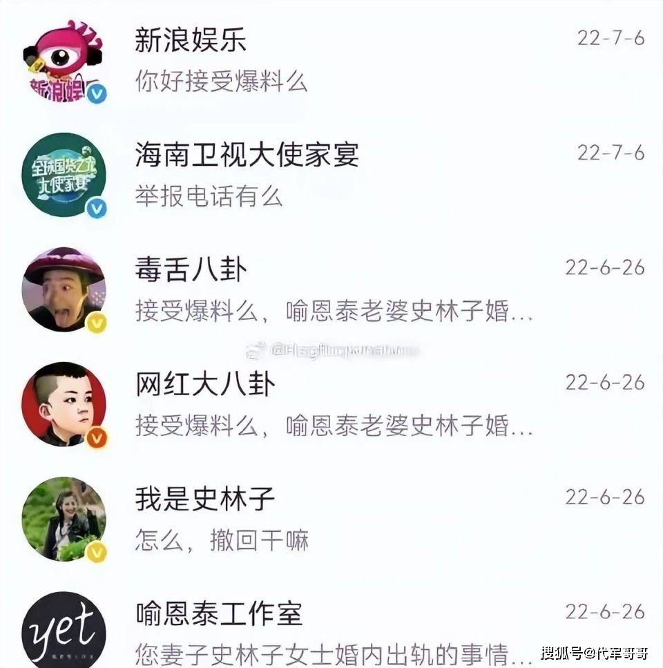 就在喻恩泰发布声明后不久,事件迎来了一个意想不到的关键反转。2022 年离婚的徐女士(游泳教练付某前妻)站了出来,实名爆料史林子在 2020 年与自己的丈夫发展婚外情。这一爆料犹如一颗重磅炸弹,瞬间在网络上引发了轩然大波,让原本就扑朔迷离的离婚风波变得更加复杂。