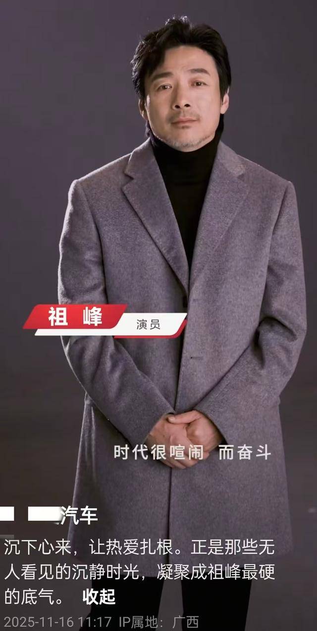 值得一提的是,就在11月16号上午11点17分,祖峰现身某著名汽车品牌的官方账号,深色从容,文案“沉下心来,让热爱扎根,正是那些无人看见的沉静时光,凝聚成祖峰最硬的底气”,或许已经证明了一切。