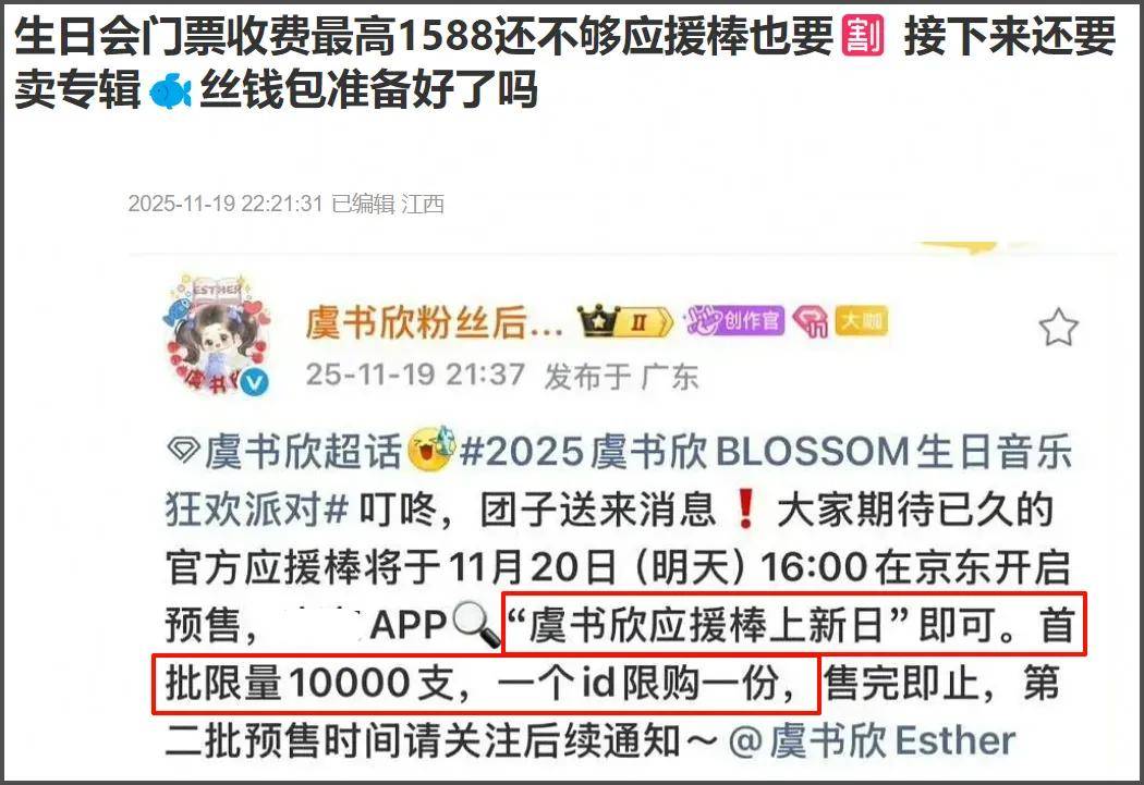不过也有网友对虞书欣生日会售卖应援棒的操作不满,要门票钱就算了,应援物还要单独收费,一般不都是随票赠送的吗?