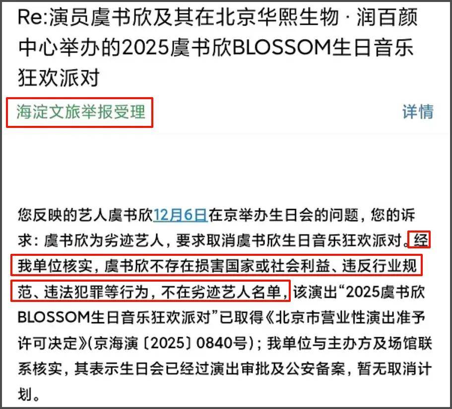 对此,网友曝光疑似海淀文旅官方给出回信,经单位核实,虞书欣不存在违规违法等行为,也不在劣迹艺人的名单上,生日会演出也获得了官方许可和备案,演出会照常进行。