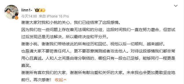 然而,这段被镜头精心雕琢的关系,仅维持了半年便宣告终结。11月20日的分手声明中,朱朱坦言“核心问题的根本性矛盾”导致磨合失败,小桃则以“专注事业”为由表明态度。双方未纠缠对错,反而强调“感恩经历”“同行一程已是嘉奖”,被网友称为“分手声明的体面范本”。值得注意的是,小桃早在10月已删除社交账号中与朱朱相关的作品,而朱朱保留官宣视频的矛盾操作,或暗示了这段关系终结的伏笔。
