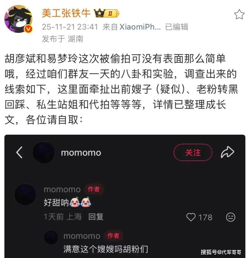 知名爆料博主张铁牛在 21 日晚间发布长文,晒出多张聊天记录和照片,证实胡彦斌在与易梦玲交往期间,还与另一位网红王阿哩保持恋爱关系。张铁牛透露,今年 5 月 20 日,胡彦斌曾飞往成都与王阿哩共度情人节,两人在某高端民宿同居 3 天,王阿哩当时还在朋友圈晒出胡彦斌送的玫瑰和奢侈品项链,配文 “520 的浪漫”,后因担心曝光删除;而 8 月胡彦斌已开始为易梦玲送咖啡示好,9 月便与王阿哩断联,存在明确的 “时间线重叠”,涉嫌 “脚踏两条船”。