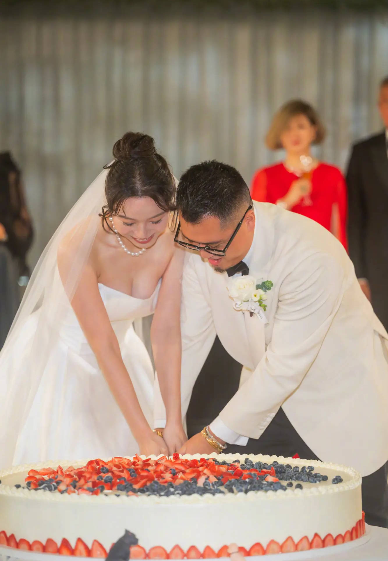 刘嘉玲晒出婚礼现场新郎新娘一起切蛋糕的合照。