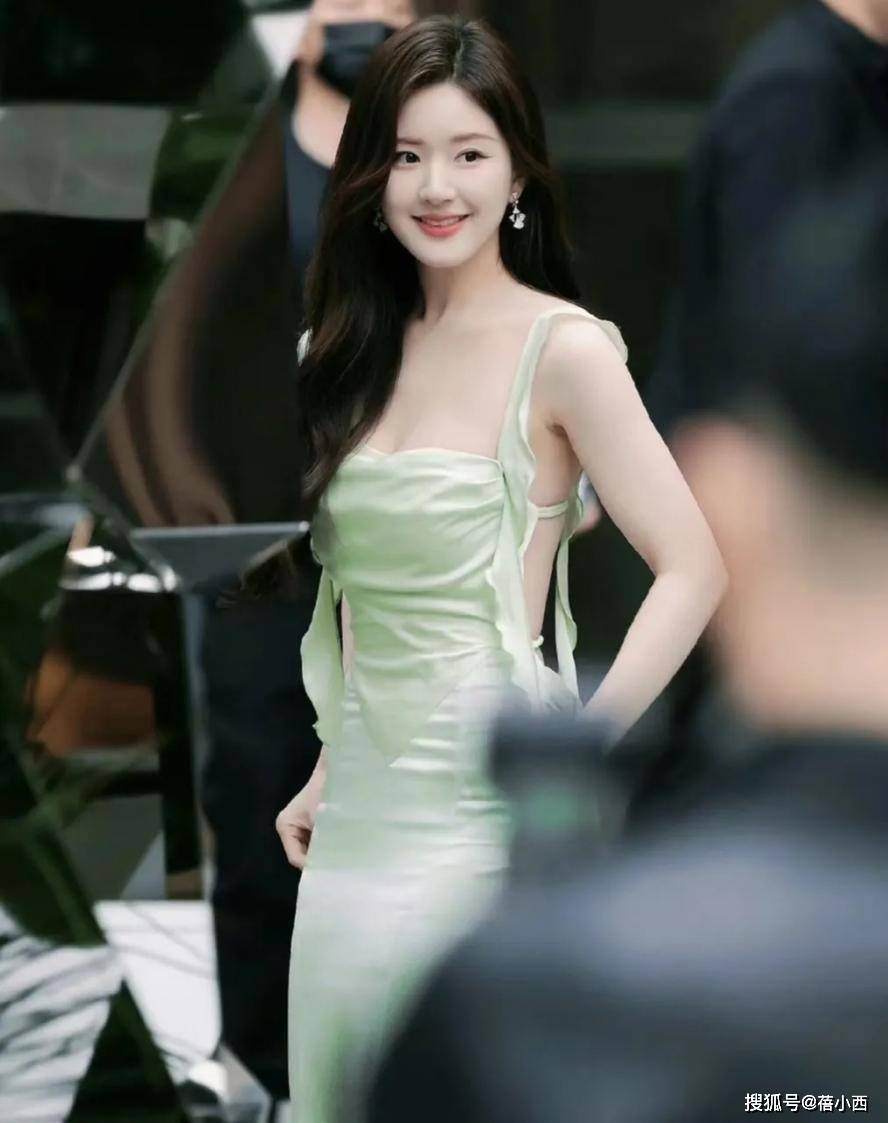 裙摆后侧可以看到开叉设计,将部分小腿展现出来,此设计还能起到拉长腿部线条的作用。露背裙颜色为浅绿色,这是一个很有活力感的颜色,驾驭起来没啥难度。女明星参加活动穿露背裙时,脚上基本会踩高跟鞋,至于其颜色,白色、浅绿色更为合适。