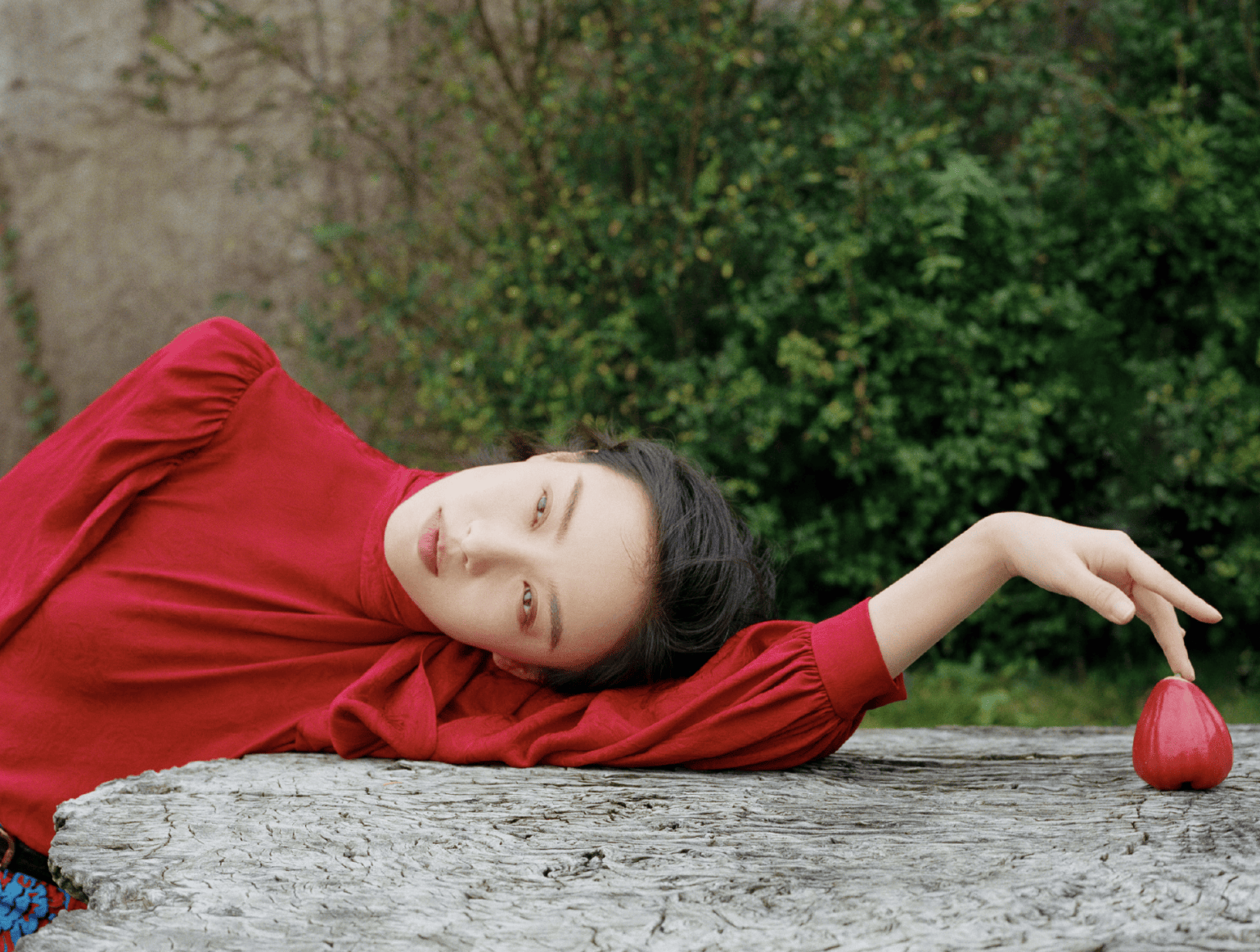 倪妮一袭红衣躺在石板上,松弛与精致兼具。
