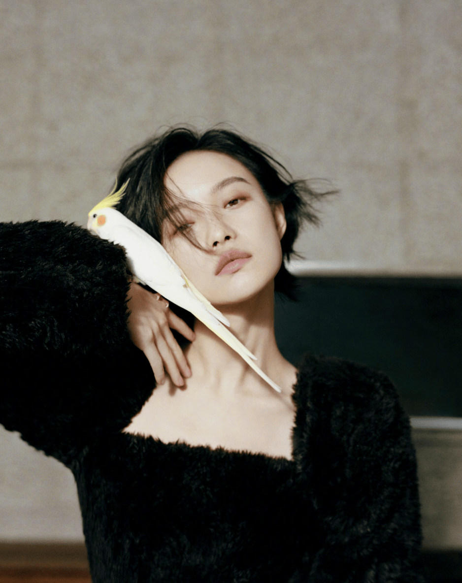 倪妮抱着小鸟轻托脸颊展露柔媚。