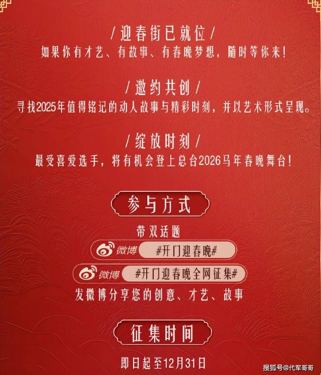 2025 年 12 月 3 日,当大多数人还沉浸在日常的忙碌中时,央视春晚官方突然发布的《2026 年开门迎春晚》节目征集令,如同一颗投入平静湖面的石子,激起了千层浪。这一消息瞬间打破了年末的沉闷,成为了全网热议的焦点。