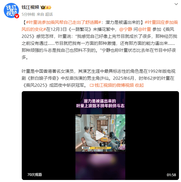 在12月3日《一路繁花》未播花絮中,宁静问叶童参加《乘风2025》感觉怎样,叶童说:“我感觉自己好像上完节目就成长了很多,那种经历我之前没有遇过……节目就把我有一方面的那种激情,还有那方面的能力逼出来……那种顽强的斗志是我自己也预料不到的。”宁静也称叶童状态比去年在节目中好很多。