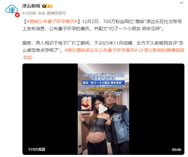 12月2日,700万粉丝网红“鹿哈”凌达乐在社交账号上发布消息,公布妻子怀孕的喜讯,并配文“约了一个小朋友,明年见呀”。