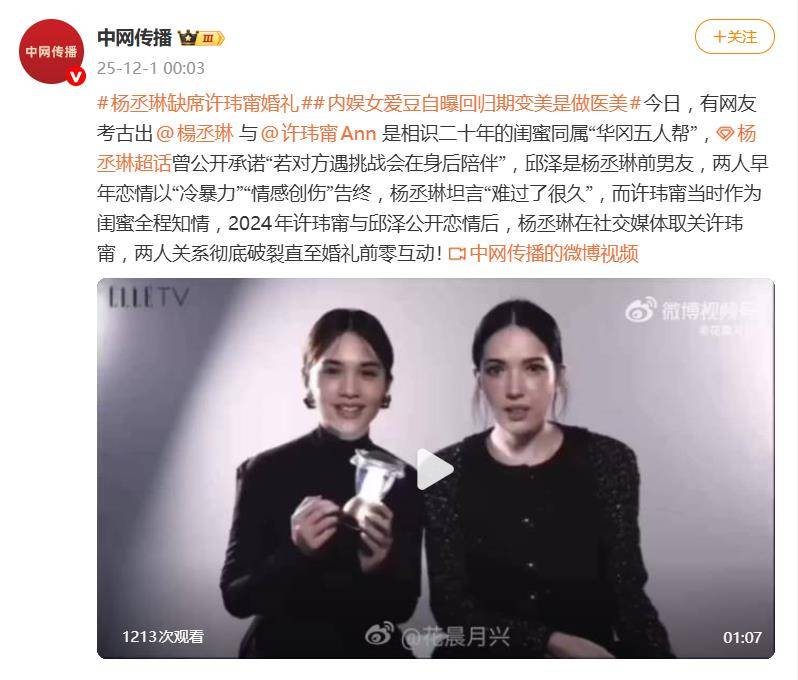 邱泽与许玮甯的婚礼本是娱乐圈一桩喜事,却因一个人的缺席掀起波澜——许玮甯相识二十年的闺蜜杨丞琳,并未现身。台媒甚至专门报道了这场“缺席”,让一段横跨二十年的情感纠葛再度浮出水面。