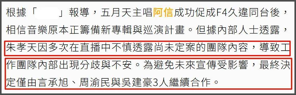 据台媒报道,朱孝天因为泄密被除名,不少网友对此都表示不满,朱孝天并没有在直播中爆料细节,只是说F4演唱会在筹备中了,到时候会有新歌,这个程度也算泄密?