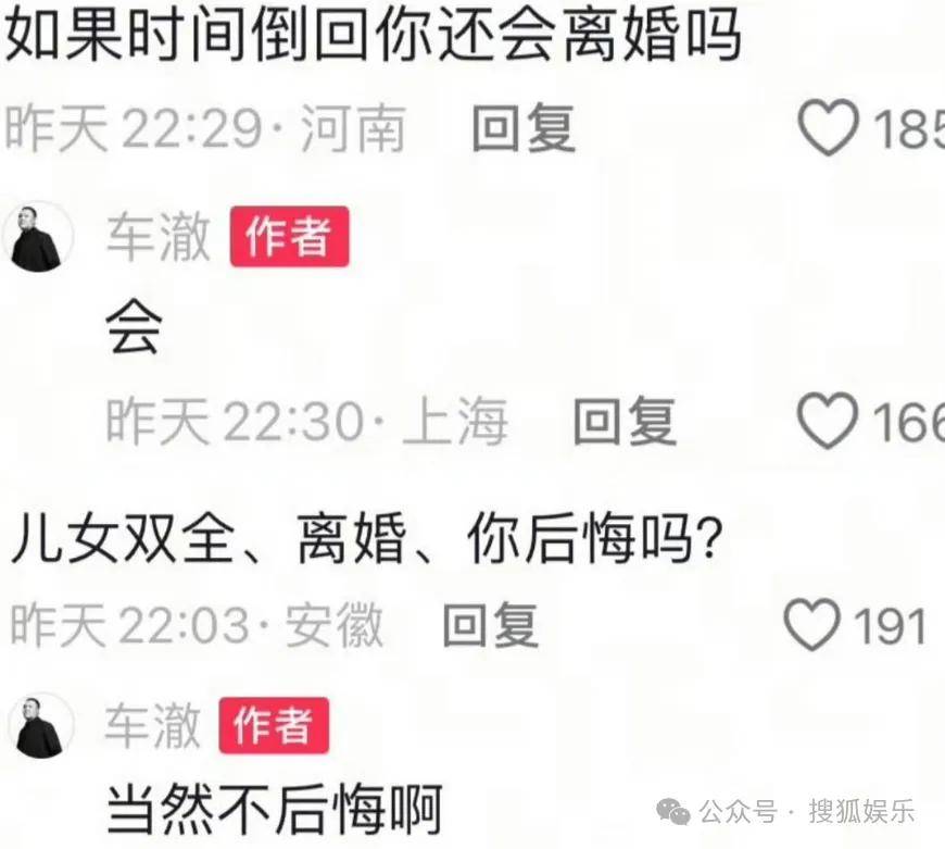 还在评论区跟网友互动,称时间倒流依然会选择离婚,也不后悔离婚↓