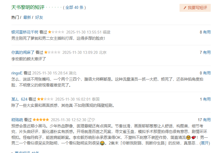 比如说,男主角刚死掉了亲爹,就可以和女主角打情骂俏,在角色情感的真实性上,就严重打折扣了。观众们的这份批评,当然是一针见血的。所以我说,这部《天书黎明》是典型的古装偶像剧,而不宜认定为探案类的电视剧。严肃探案的电视剧讲求的是叙事逻辑的合理性。而这部戏,不讲叙事合理性,只讲爽感。