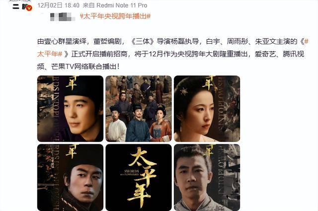 12月2日,《太平年》定档的消息冲上了热搜,该片将会在央视八套播出,首播时间就在跨年期间。