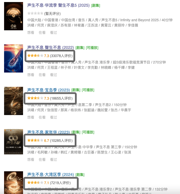 但一个不争的事实是,市场对这一IP的关注度正逐渐消退。豆瓣上对这一IP的打分人数从首季的3.3万人逐年下滑,到了去年的《声生不息·大湾区季》仅有7219人参与打分,节目对市场的影响力大不如前。