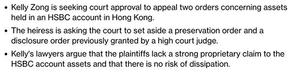 娃哈哈集团继承人宗馥莉就香港汇丰账户内18亿美元离岸信托资产,向香港上诉法庭申请许可,要求撤销高等法院此前下达的资产保全令与披露令。这已是她在本案中的第三次法律出击,直指三名非婚生子女兄妹“缺乏强有力所有权主张”。