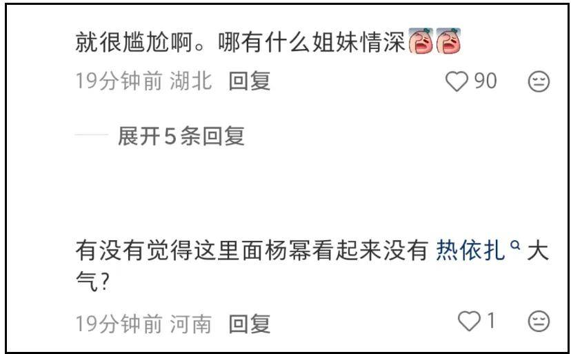 相关视频评论区,不止一位网友察觉到了二人互动别扭,有人一不小心说了大实话,指出杨幂和热依扎之间存在正面事业竞争,互相有点情绪并不意外。