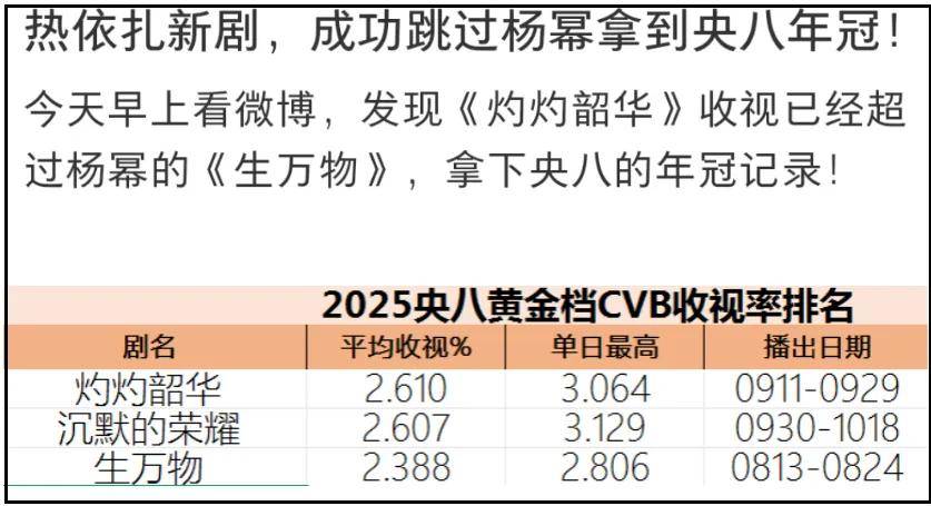——2025年,热依扎主演电视剧《灼灼韶华》在央视播出,收视刚刚好超过了杨幂主演电视剧《生万物》,杨幂见到热依扎就喊上了“华华”,可见她还是挺关注同龄女星事业发展的。