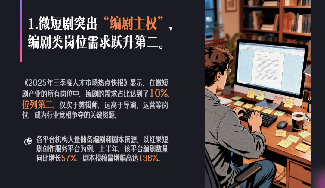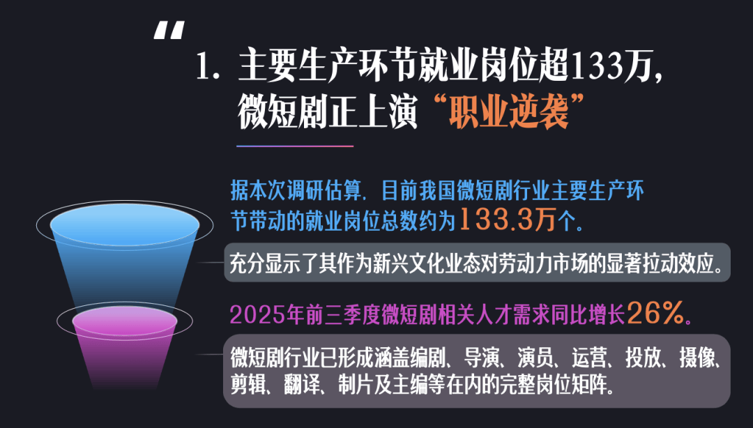 报告显示,微短剧行业主要生产环节已带动133.3 万个就业岗位,2025年前三季度相关人才需求同比增长26%,形成覆盖编剧、导演、运营、投放等全链条的岗位矩阵,成为视听领域高潜力就业赛道。