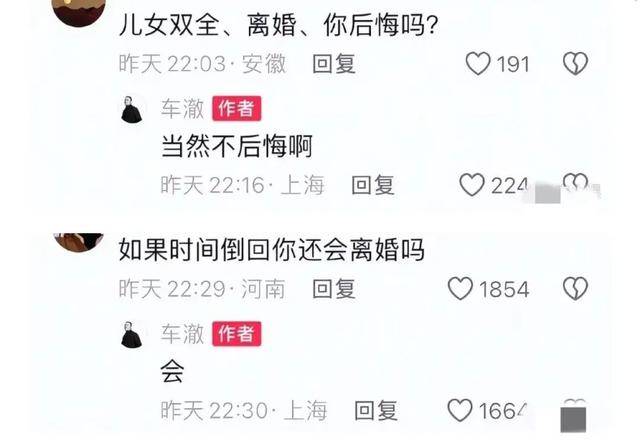 今年九月份刚官宣离婚,车澈还在评论区硬气地说“不后悔,如果时间倒回还会离”。