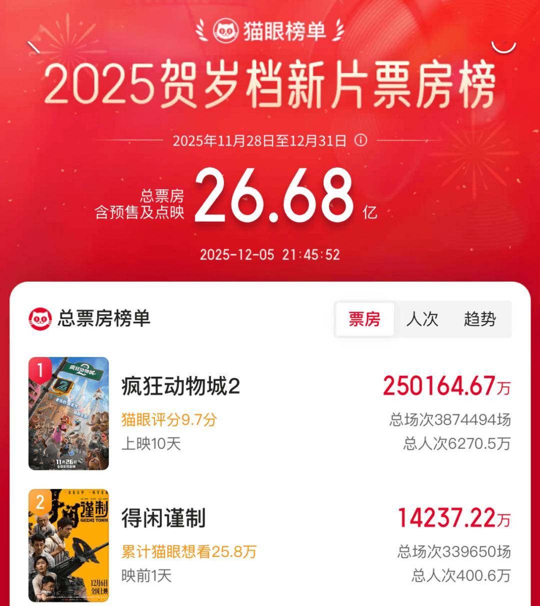 据网络平台数据,截至12月5日,2025年贺岁档新片总票房突破26亿,《疯狂动物城2》《得闲谨制》分列贺岁档新片票房榜前两位。