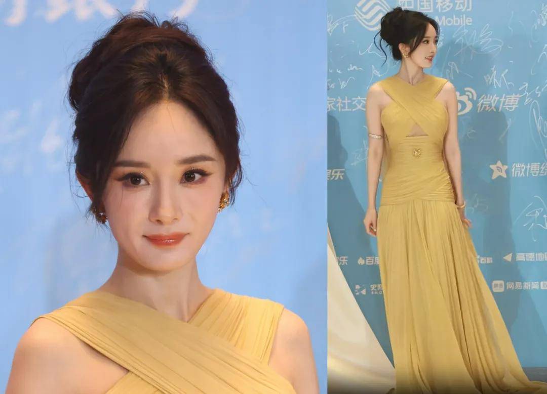 杨幂穿了一条金色真丝薄纱礼服,不仅勾勒出身材曲线,还凸显了她温柔的一面。不得不说近几次她的活动造型风格不一,但都挺适合她的。