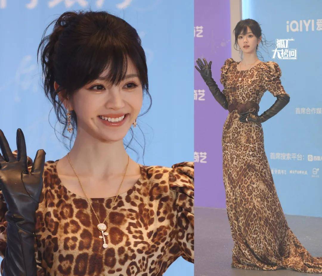 田曦薇选了一条她无法驾驭的豹纹长裙,一来她的长相偏可爱甜美,二来她身材偏瘦,总的来说很难展现出风情,所以会像小女生偷穿姐姐的衣服。