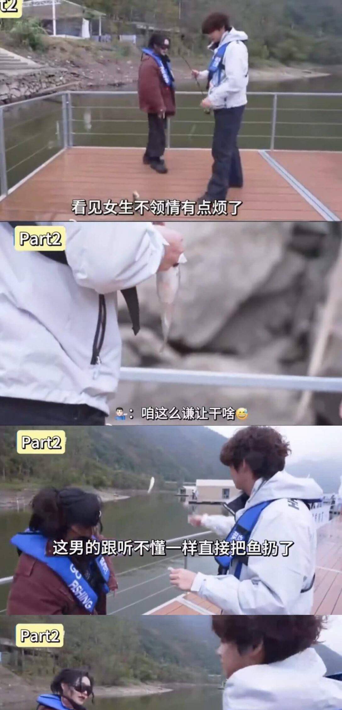风波并未就此停歇。随后,徐滨钓上一条鱼,试图上演“霸道总裁式”的赠予戏码,却被谢可寅果断拒绝——不是自己劳动所得,坚决不要。没想到,示好碰壁的徐滨,下一秒竟直接将鱼扔回河中!这一扔,让谢可寅当场愣住,也让屏幕前的观众瞠目结舌。