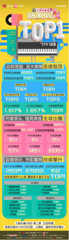 由江苏卫视与爱奇艺联合出品、京都念慈菴独家冠名的《音乐缘计划2》第七期节目播出后热度不减,持续领跑收视。该期节目于每周五晚20:30在江苏卫视、ai荔枝、爱奇艺多平台播出,薛之谦、张靓颖、周深、刘宇宁、黄子弘凡、魏翔、欧阳娜娜等歌手联袂呈现十个首演舞台,再次以高质量音乐内容引发全网热议。