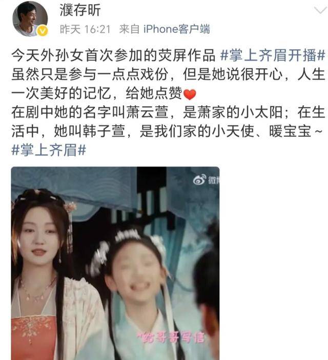 正当大家点开这部作品想要一探究竟的时候,网友发现濮存熙的外孙女名叫韩子萱,据说这是她首次拍戏。