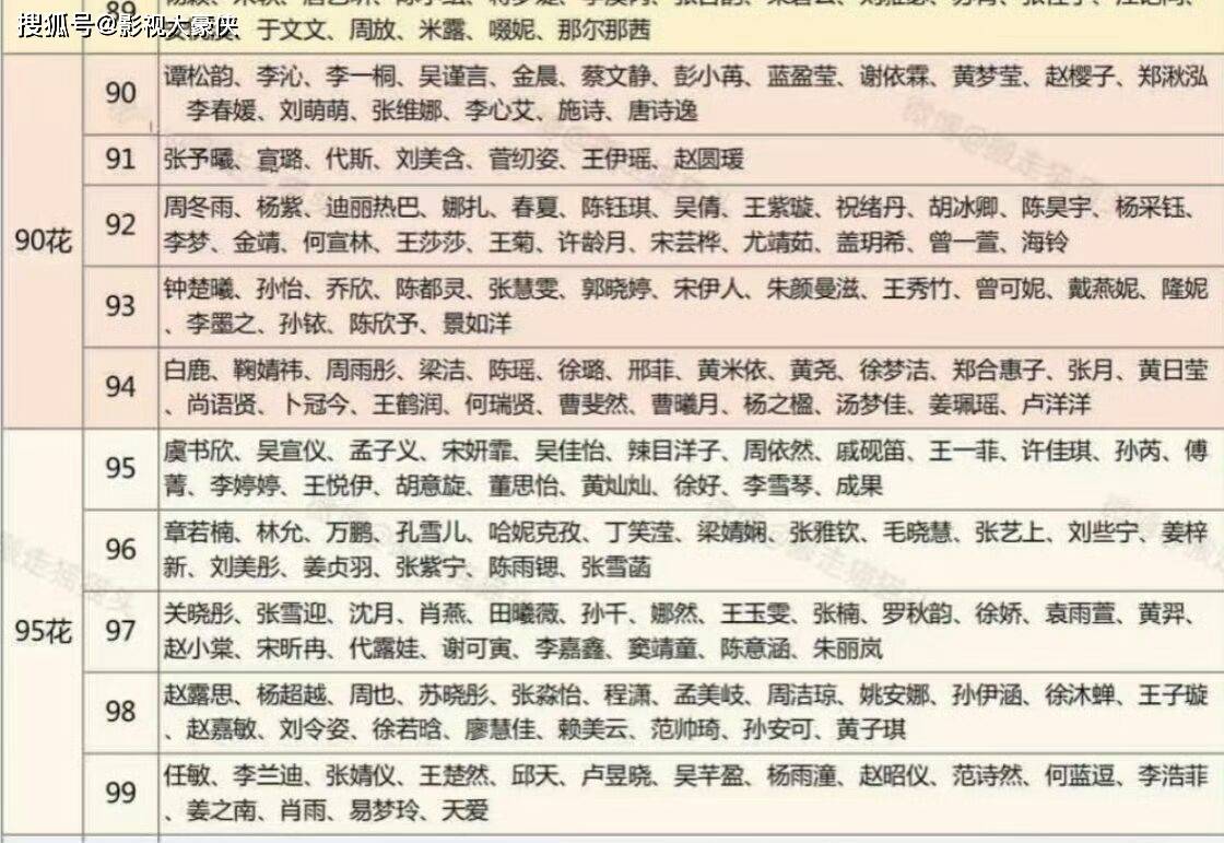 圈内90花格局很大,很多知名的人,但要说几年前都还不是流量的,也很多,李沁,钟楚曦,金晨,陈都灵,周雨彤,蔡文静,吴谨言,乔欣,孙怡,杨采钰等,都是厚积薄发红的,不算是流量艺人,当然很多今年已经成为流量艺人了,75后男星也挺多的,难以想象很多我们脸熟的居然都近乎50岁了,奔五的人,30岁的女星搭配快50的男星,这都下得去嘴,令人错愕,的确足够震惊。