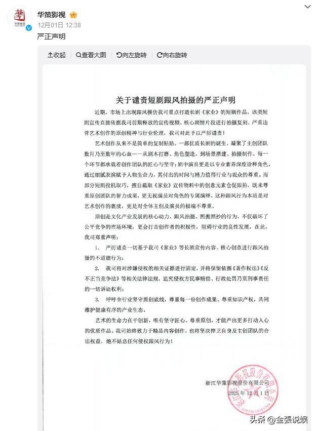 12月1日,华策影视发了一份声明,内容直指杨紫的待播剧《家业》被短剧抄袭。