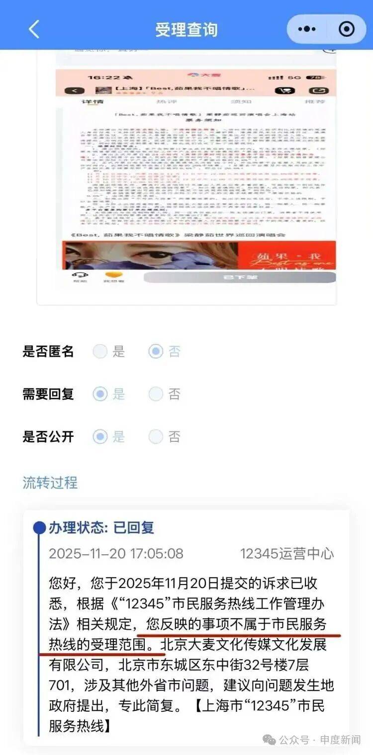 随后,叶女士又拨打了北京12345,工单被转至北京文旅部门。但北京文旅的工作人员告诉她,“演出举办地在上海,应该找上海方面协调”。