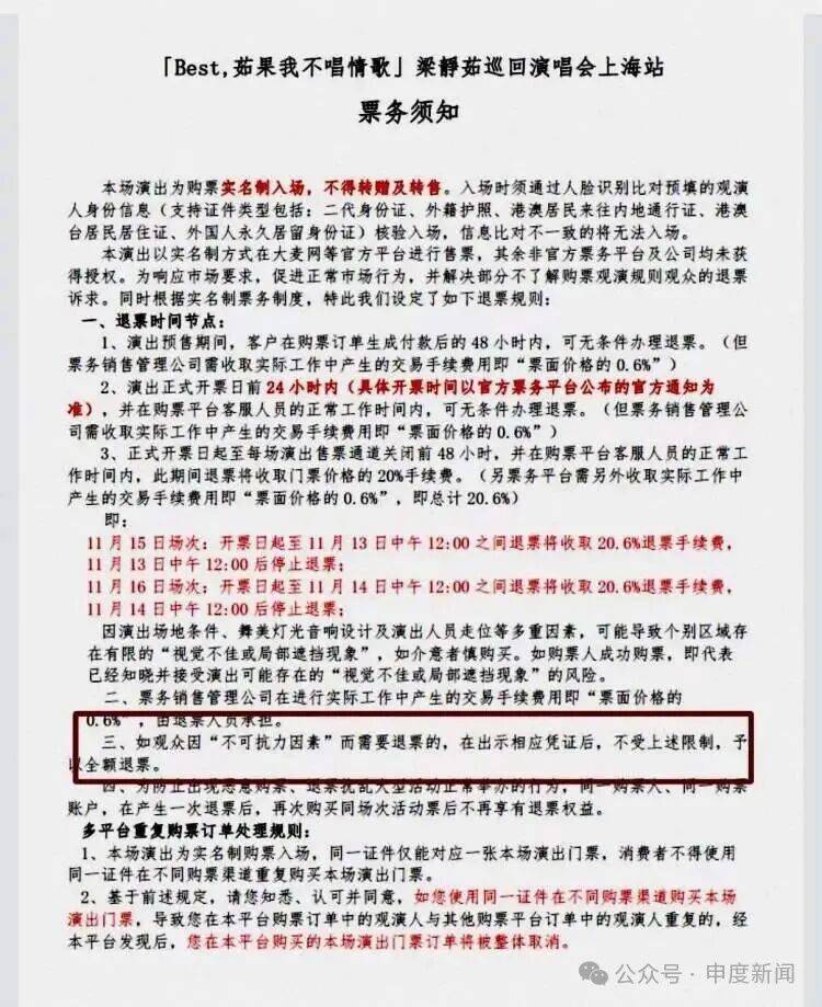 记者查阅大麦网公示的该场演唱会票务须知发现,其中明确了阶梯退票规则:演出预售期间48小时内可无条件退票(收0.6%手续费);正式开票日前24小时内可无条件退票(收0.6%手续费);正式开票日起至演出售票通道关闭前48小时内退票,需收取20.6%手续费(20%退票费+0.6%手续费);售票通道关闭48小时后停止退票。同时,须知中第三条规定:“如观众因‘不可抗力因素’而需要退票的,在出示相应凭证后,不受上述限制,予以全额退票。”