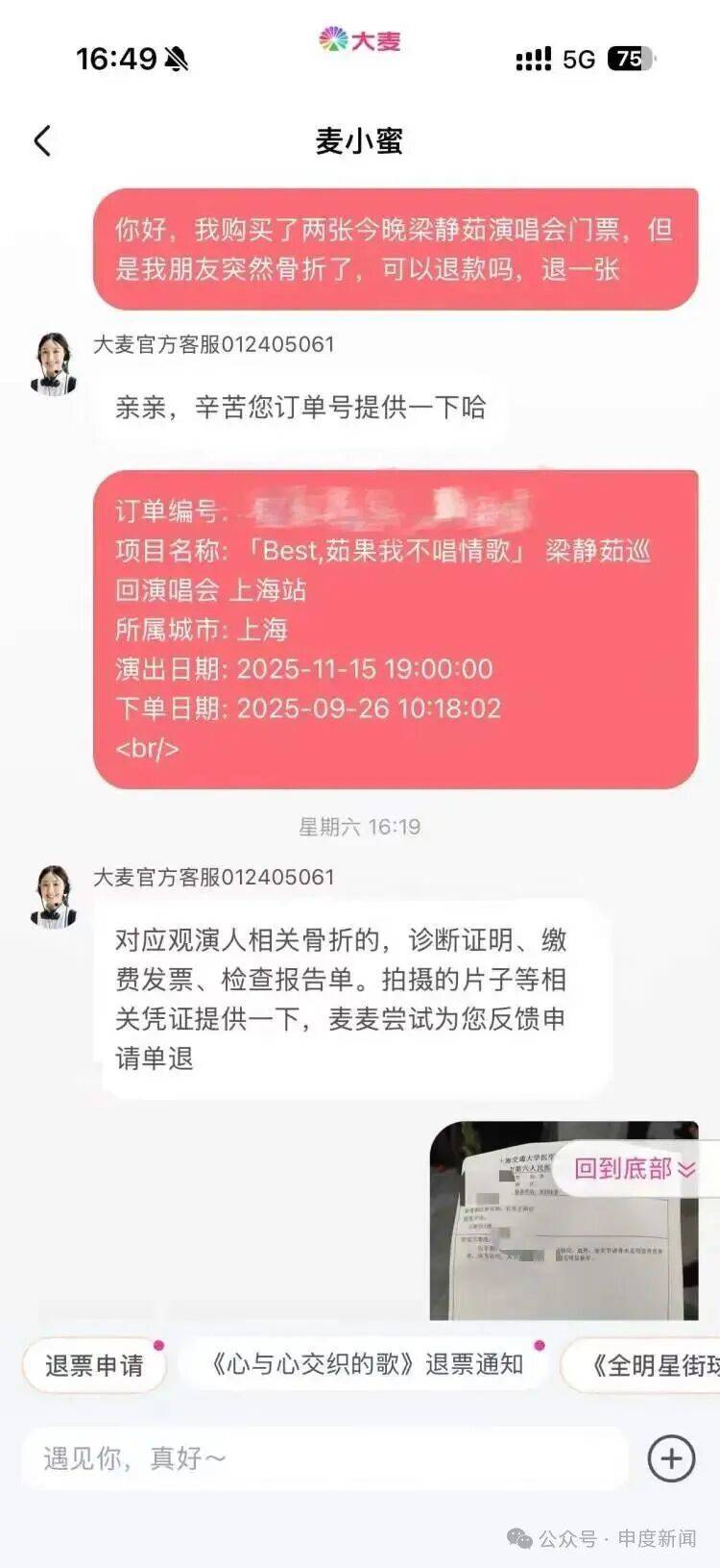 “我当天中午就赶紧联系了大麦客服,提交了就医证明,希望退掉我老公的一张票。”