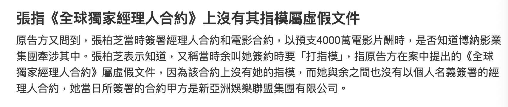 张柏芝在第一次出庭作供的时候声称在2011年前并不认识余毓兴,更称对方所展示的《全球独家经理人合约》是虚假文件,因为她没有按下指纹,此外她还表示自己没有以个人名义签署经理人合约。而张柏芝在被问及既然与对方不相识,但又为何要与对方签约的时候,张柏芝称为了赚钱。总之目前的情况就是,双方就是各执一词,谁是谁非大概也只能等待法官来定夺。
