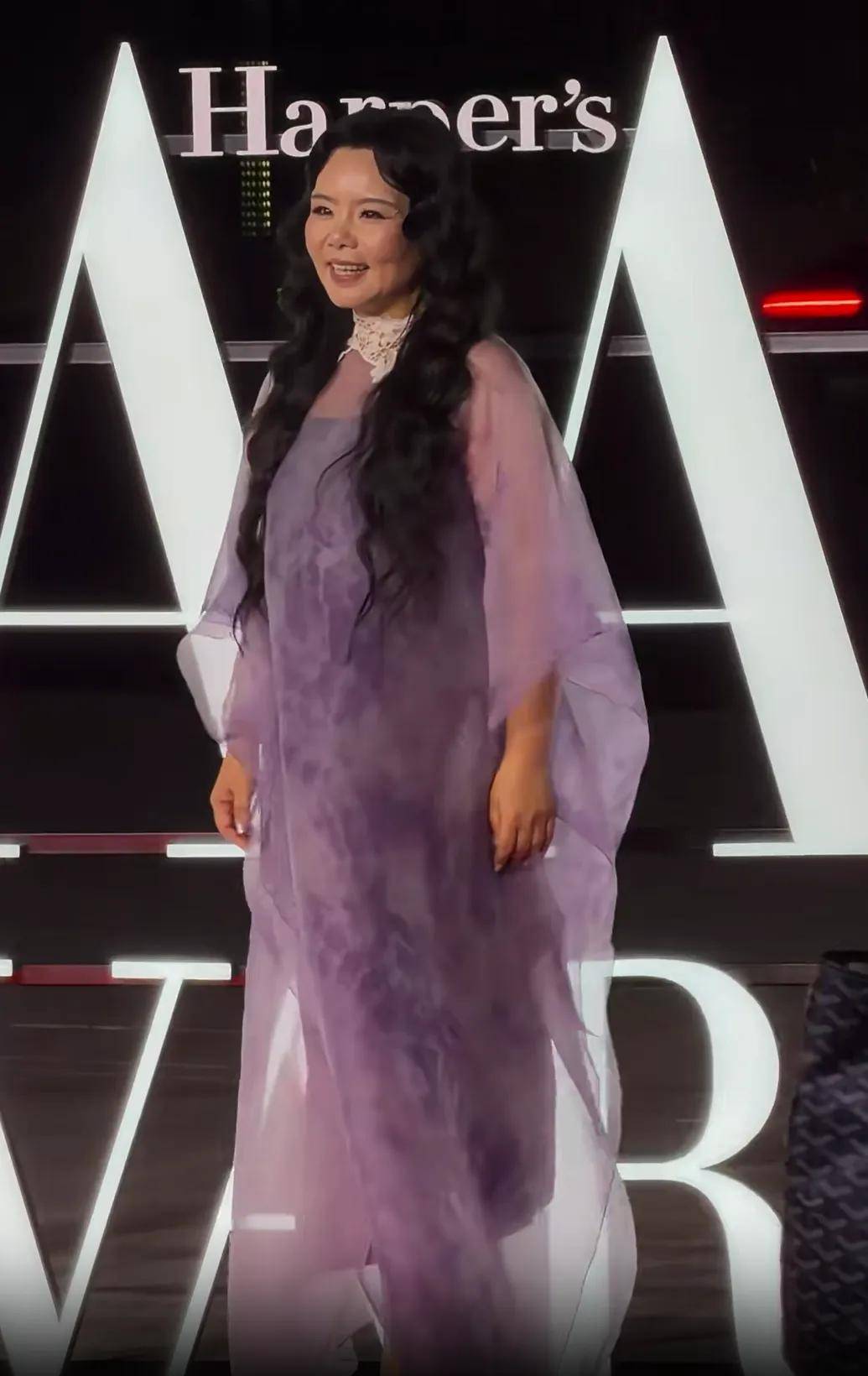 龚琳娜穿了一条飘逸的紫色纱裙,对比之下她的苹果肌反而显得厚重了,嘭弹得有点过了。感觉中年女明星还是不要追求过于充盈的苹果肌,否则无论镜头有没有美颜滤镜,都会不自然。
