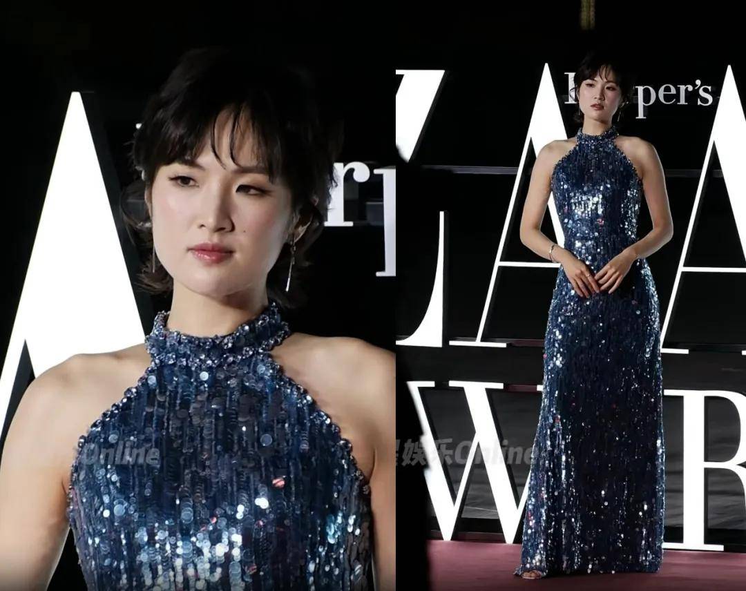 姚安娜穿了一条蓝色亮片挂脖长裙,短发的她比长发更有辨识度,再加上她身材高挑,所以很适合穿这种类型的长裙。
