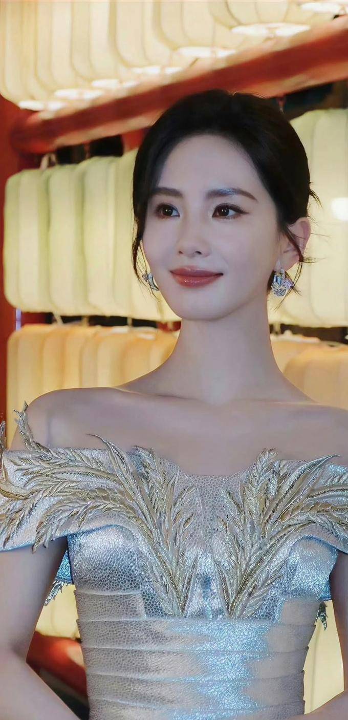 上半身的深V尽显成熟女人的魅力,缀有金色宝石的薄纱让白鹿看起来就像个女王一样。