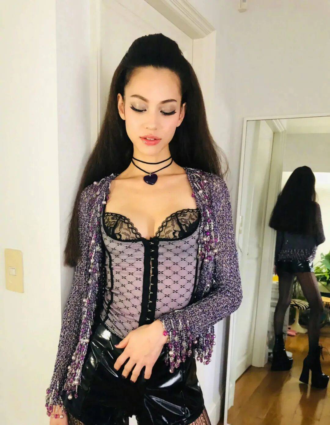 水原希子穿着棕色上衣,搭配黑皮短裤和抹胸上衣,她俏脸风情万种,长发飘逸,露出自己的事业线,曼妙的身材曲线,绝对性感妩媚!