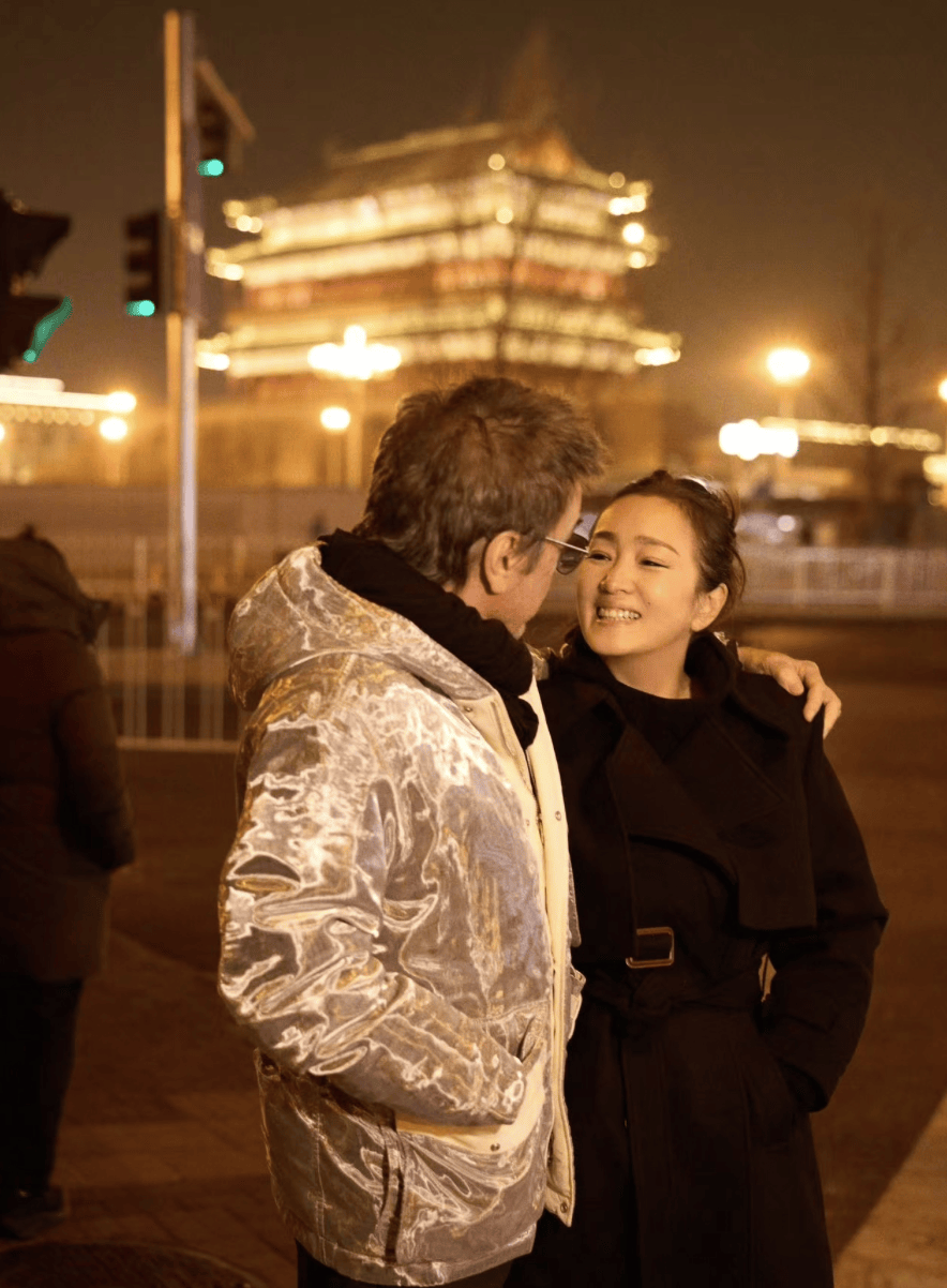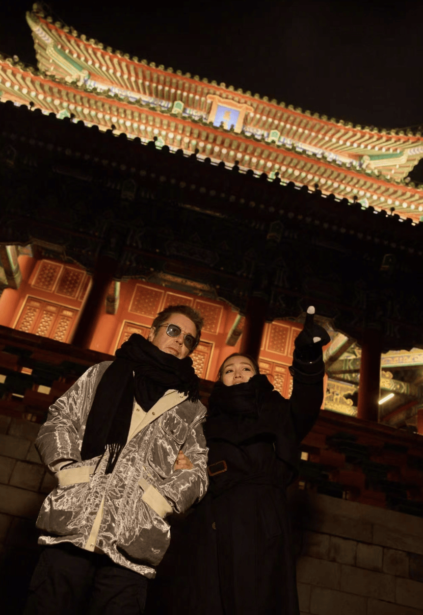 巩俐与老公打卡古建筑,传统建筑背景让文化与温情交织。