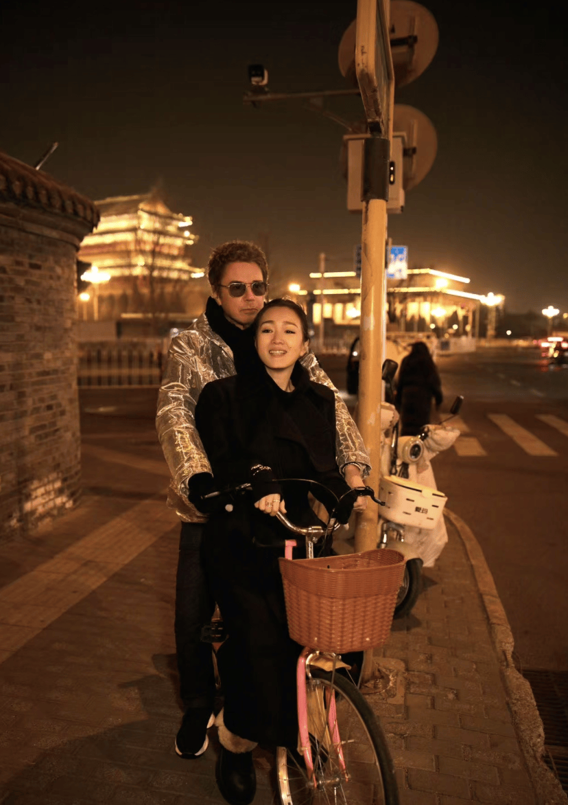 巩俐和老公同骑自行车,温馨感十足。